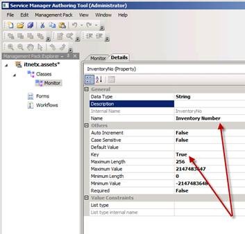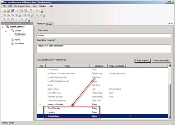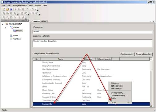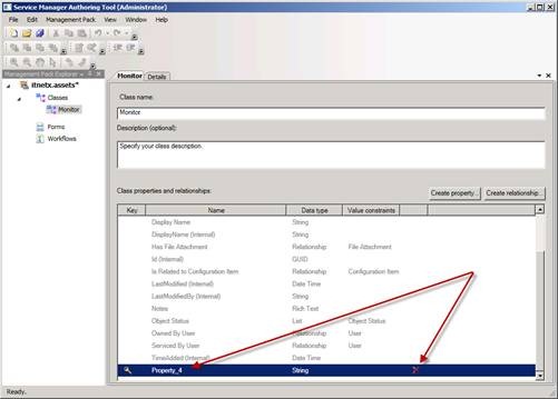 The new Class inherits all Properties and Relations of the Base Class “Configuration Item”. Additionally, an attribute called “Property_X” is created which is marked as a key property. Every class must have a property marked as key property. The value of this property has to be unique for every instanced object of the class. For this example we will delete the automatically created property and create a new one called “InventoryNo” for storing the Inventory Number of the Monitor Objects. This new property is then marked as the key property for the Monitor-Class and it’s given a meaningful name.