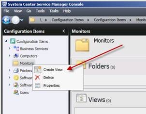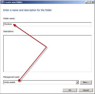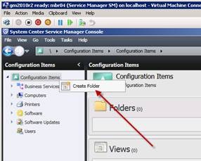 Now save the Management Pack and import it by using the Service Manager Console. After the successful import, the new Monitor-Class is known within the Service Manager Environment. Now, for viewing objects of the new Class, we have to create a new view. Switch to the Configuration Item Area and create a new folder. Store the new folder in the Management Pack we created earlier.