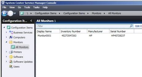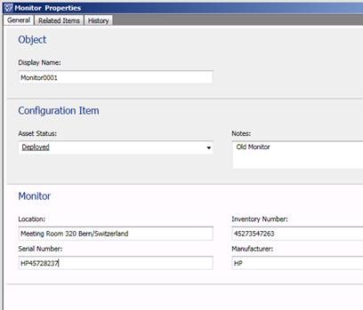 “Asset Status” and “Notes” are inherited Properties from the Base Class “Configuration Item”. Additionally, all Properties that you added in the Authoring Tool are visible. The generic form is automatically generated. However, it’s also possible to generate a customized form either in the Authoring Tool or in Visual Studio. In the list view you can now easily see all Monitor-Objects.