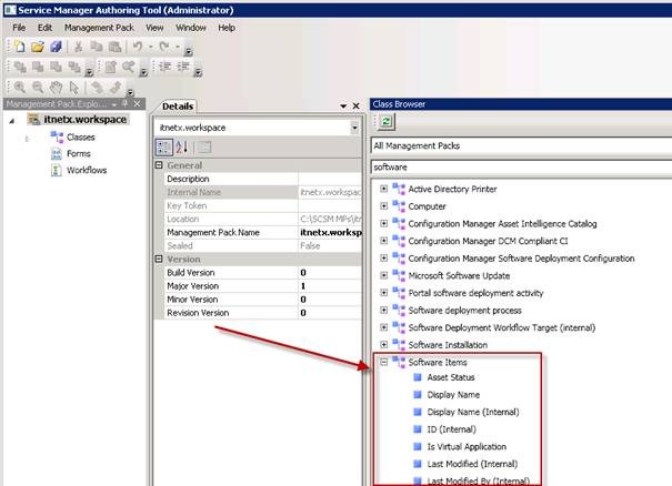 Then, an XML file must be created that holds the exact Identifiers of the needed properties. If you are unsure what the exact names are, you can easily verify those by using the Authoring Tool. Just start the tool and switch to the Class Browser. Search for “Software Items”.