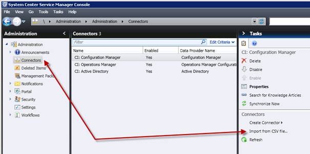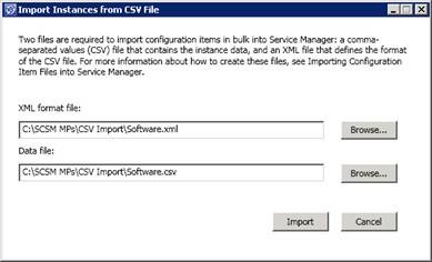 Now it’s time to start the Import Process. This is done by using the Service Manager Console. In the “Administration”-Section you have to start the “Import from CSV file”-Task and specify the correct path to the two files.