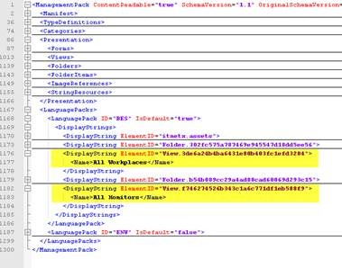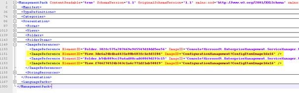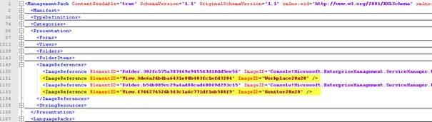 After you have created the views in the Service Manager Console you have to export the Management Pack. Then open it using your favorite XML-Editor. In the “Presentation”-Section you will find another Section called “ImageReferences”. This is where the Images are connected to Views and Folders. When you have created Views and Folders in the Service Manager Console you will see IDs that you cannot interpret. You must check the IDs in the “Languages”-Section of the Management Pack to see what Image Reference belongs to a specific View or Folder.