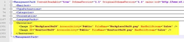 Now we have to map the ImageIDs to Image-Files. For this, we have to add a new Section to the Management Pack called “Resources”. This is placed at the very end. In this example I map “Monitor20x20” to a file called “Monitor20x20.png” and “Workspace20x20” to a file called “Workspace20x20.png”. 20×20 is the perfect size for View and Folder Icons.