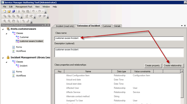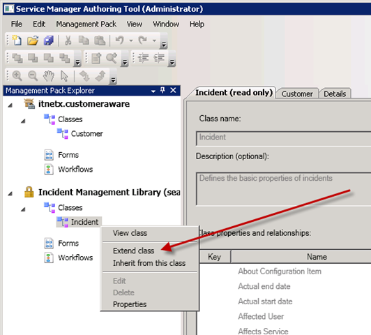 Next a new Relationship has to be created to link Incident objects to the customer objects. Therefore, I add a new Relationship to the Incident class and call it “IncidentFromCompany”. To do that, I have to extend the Incident Class and select an unsealed Management Pack to store the extension.