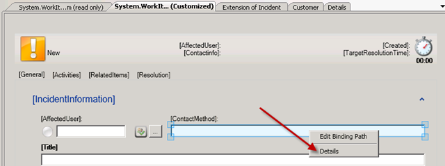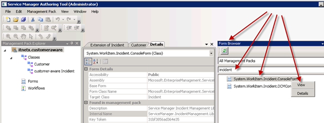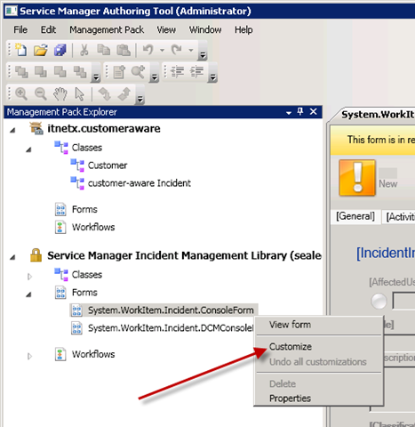 To choose a customer/company for an Incident, a new field has to be added to the Default Incident Form (or whatever form you use for Incidents Management). So I choose the Incident Form from the Form Browser and start customization. The form ist called “System.WorkItem.Incident.ConsoleForm” and i choose the same Management Pack for storing the customization as before.