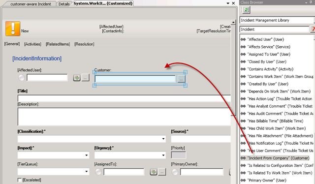 Now I drag the relationship “Incident from Company” from the Incident class (that I extended before) directly from the class browser onto the form.