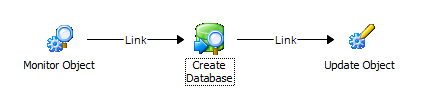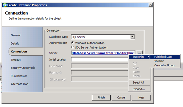First, a connection to a SQL Server is established. Because the Servername on which the new database will be created is contained in the Change Request activity, I will not hardcode the servername, but use published data from the “Monitor Object” object. as you can see, it’s possible to access data from other object by using the Opalis data bus. This is very powerful as you have the possibility to exchange data very easily between objects. In this case I use the attribute “Database Server Name” that we configured for our custom activity in the first Part.