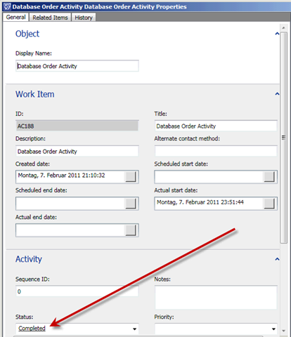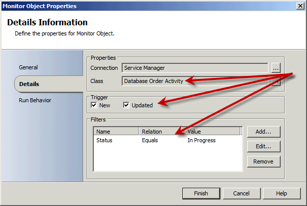 The “Monitor Object” comes from the Service Manager Integration Pack and checks for Changes in the Service Manager Database. I configured the object to watch for newly created objects as well as for update objects of the class “Database Order Activity”. An additional filter will only look for such objects if they are in a “In Progress” state. I such an object is discovered (no matter how the object is created in the Service Manager database …) the workflow kicks in.