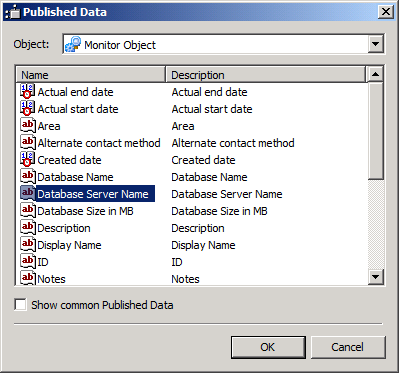 Now we’ll again use published data from the “Monitor Object” object to generate a dynamic statement. We will use information such as “Database Size” and “Database Name” from the custom activity. The query will then look like this: