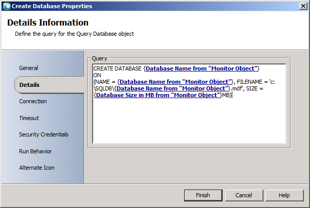 The second object holds most of the workflow magic. It an object of type “Query Database” and is one of the Opalis foundation objects. The name of the object is a really misleading as you can not only query databases, but run any statement you want. In this example I will configure the object to create a new SQL database on a specific server with specific settings … all contained in the Activity that comes from a Service Manager Change Request.