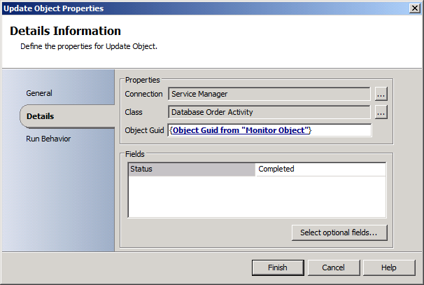 The last object of the workflow is again very simple as it only updates the custom activity status in Service Manager to “completed”. Again, published data will be used because we have to define which object we want to update. Therefore we will use the object GUID that will be published by the “Monitor Object” object.