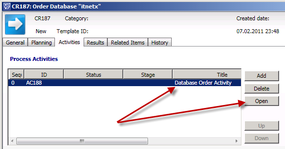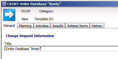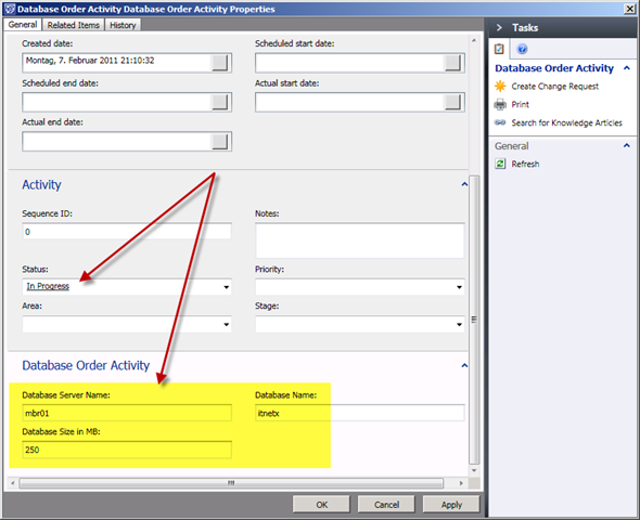 Now it’s time to check if our Opalis Workflow executes as expected. Therefore I create a new Change Request based on the Database Order Change Request Template and I configure the details in the Database Order Activity.