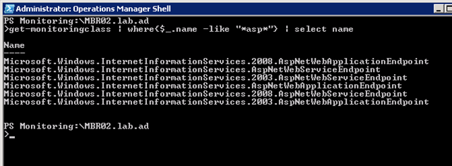 Since our class (IIS 7.0 ASP.NET Application Endpoint) is not on the list and it does not derive from one of the listed classes, we have to add the class to the filter. To find out the exact name of the needed class you can use the Operations Manager Shell on one of the SCOM Servers. Using the cmdlet “get-monitoringclass” you can display all classes. Use a where-statement to narrow down the displayed classes. At the end, note the name of the class that you need. In our example the name is “Microsoft.Windows.InternetInformationServices.2008.AspNetWebApplicationEndpoint”.