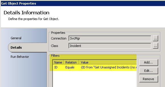 This Activity comes from the Microsoft SCSM OIP. I need it to get the Object GUID from all found Incidents. This GUID is needed to update the objects with the next Activity. To get the GUID I set a filter to the ID and use Published Data from the “Get all unassigned Incidents …” object. This means, that it will get the GUID for every Incident that was found in our workflow.
