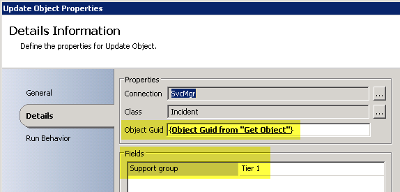 I will now use the second Activity from the Microsoft SCSM OIP to update the Support Group attribute to the desired Tier. To specify the GUID I use Published Data from the “Get Object” Activity. Then, I choose the “Support Group” attribute and select the Tier from the list.