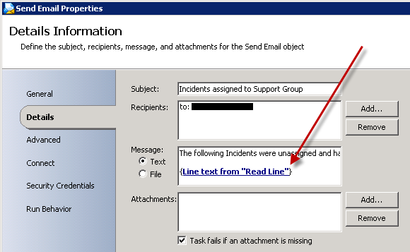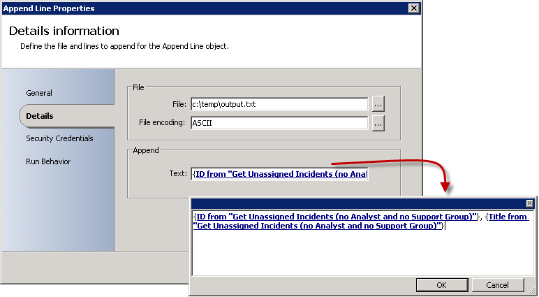 Because I want to inform someone about the auto-assignment of those incidents, I will write some information to a file. The content of this file will later be used as the body for a notification mail. I just use the ID and the Title of the Incidents for this example.