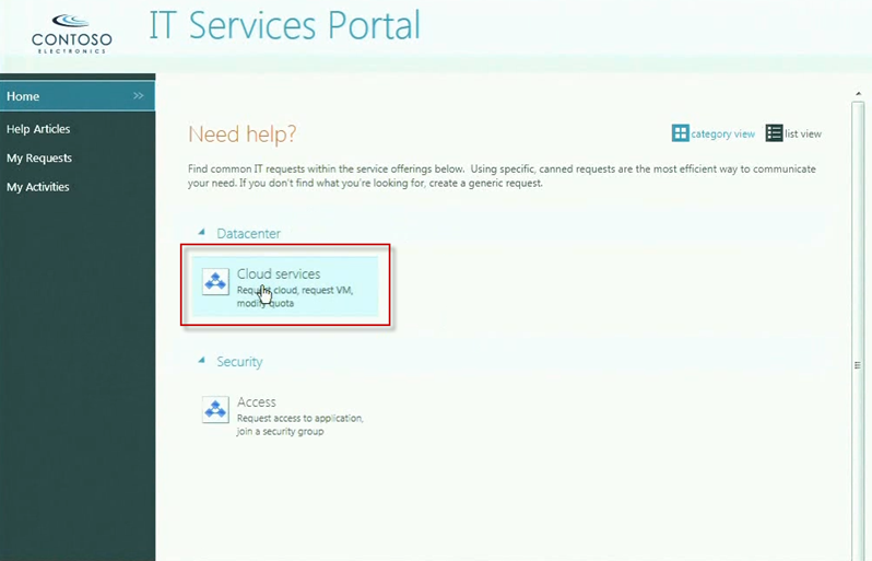 After choosing the needed Service Offering – in this case “Cloud Services”, the different Requests Offerings are presented to the User. If needed, the user can open help articles that are published to help them with their request.