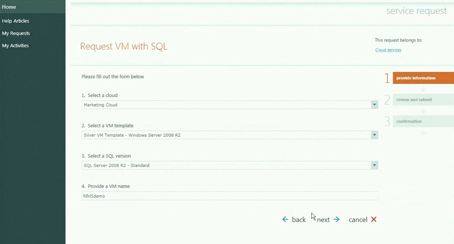 Now based on the chosen Request Offering, the user has to answer some questions. In this case a VM Template, a VM Name and some more. It is very important to capture structured and complete data from the user if we later want to successfully execute runbooks in System Center Orchestrator.