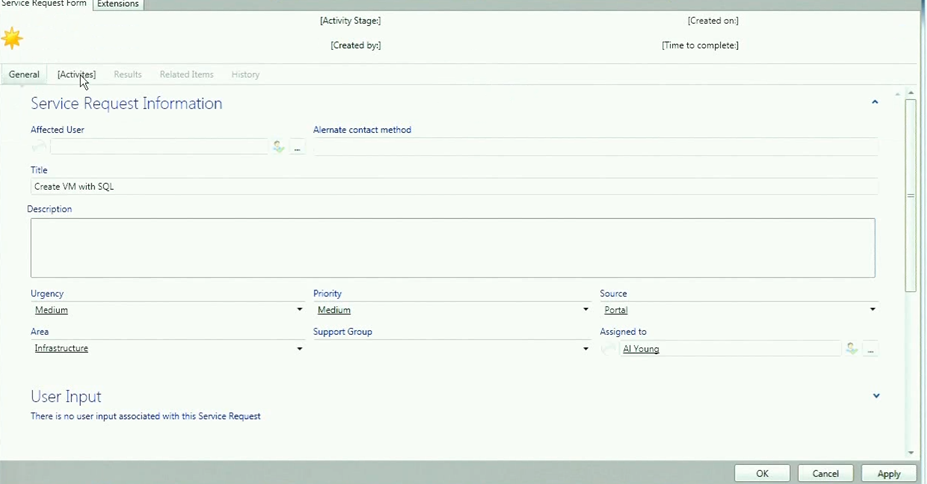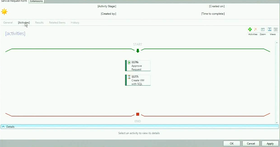 The Service Request has one or more Activities, based on the Service Request Template that was chosen earlier. In this case we only have 2 Activities. The Approval Activity allows a defined Person (e.g. a Team Leader) or a Line Manager to approve the Request. If the approval is done, the next Activity will start. Because the second Activity is a Runbook Activity, a runbook in System Center Orchestrator is triggered.