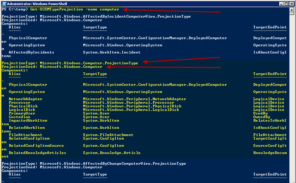 Where do you get this information from? There are several documents about that, but you can also find out yourself what the exact names of the projections and classes are by using Powershell with the smlets. There is a nice cmdlet called “get-scsmtypeprojection” that lists the available projections and also displays the seed classes.
