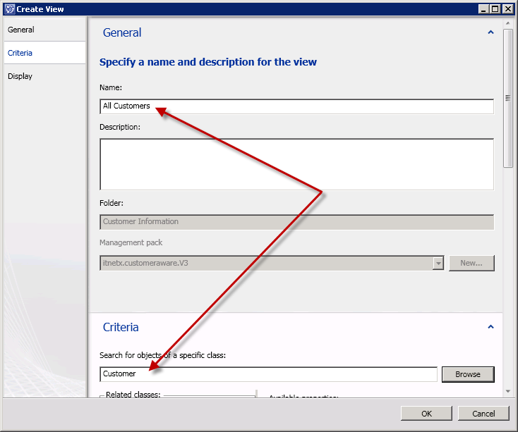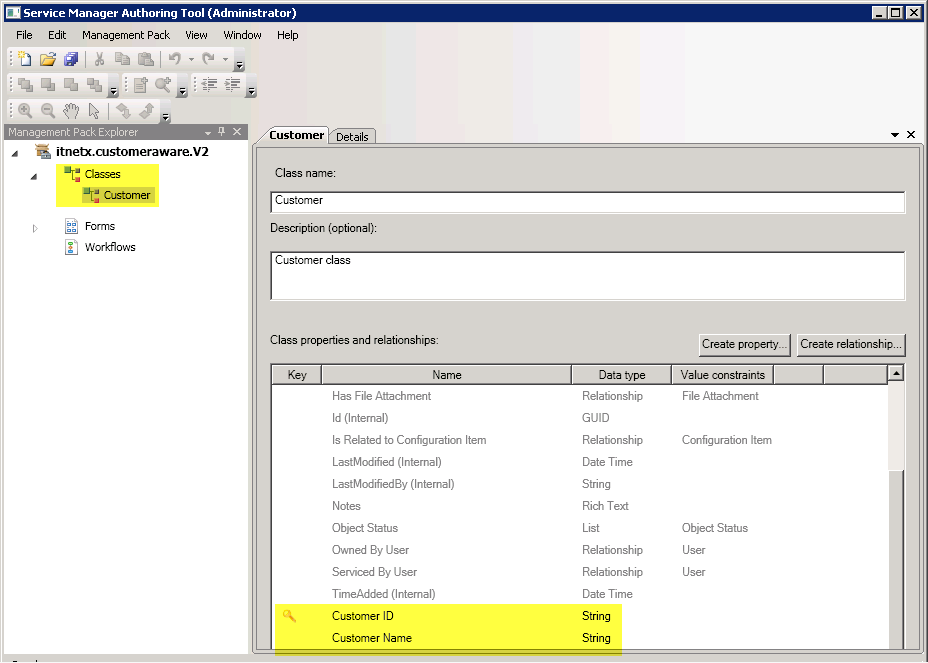 First of all I have to create a new Management Pack and a new class that will store information about customers. I do this by using the Authoring Tool, create a new class and define some properties I need. For this example, I just defined two attributes, the Customer ID and the Customer Name, where the Customer ID is an autoincrementing key property. For a production environment, you can add more attributes as needed.