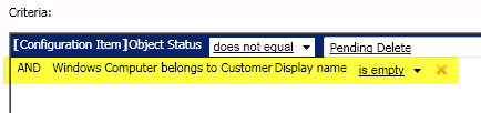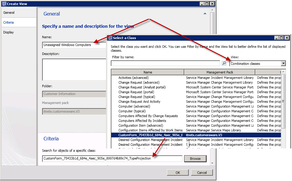 The next view I create will show all Windows Computers that are not yet assigned to a customer. I select “Combination Classes” and choose the Type Projection that is stored in my Management Pack (called CustomForm_xxxxxx). Then i define the criteria so that only Windows Computers are displayed that to not have a value in the “WindowsComputerBelongsToCustomer” display name field.