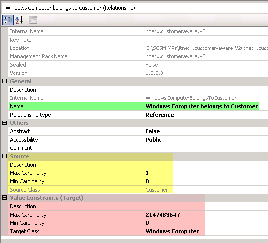 I call the new relationship “WindowsComputerBelongsToCustomer” and do some editing afterwards. I change the name to make it better readable and configure the relationship source and target – the source is the customer class, the target must be changed to “Windows Computer”. Because at the end a customer can own multiple Windows Computers, but a Windows Computer can only belong to one single customer, I have to change the cardinality (many-to-1/0).