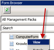 Now as the data model is ready, I need to present the information on a form. Because we are talking about Windows Computers, the form “ComputerForm” has to be customized. The form can be found in the form browser of the Authoring Tool. Because this form is stored in a sealed Management Pack, an unsealed Management Pack must be chosen to save the customizations.