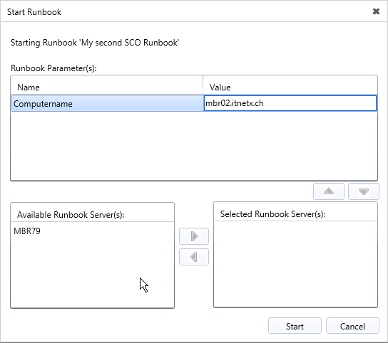 - Provide input if needed by the started runbook and select Action Server to run the runbook (if nothing is selected, the default configuration of the Action Servers is used)