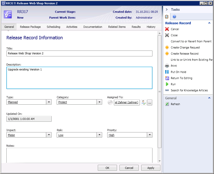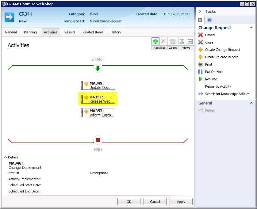 Here’s an example of a Change Request. One Step would be releasing the new build. For this, a dependent activity can be used. As you can see, those kind of activities have a “linked to” attribute which is empty because there’s no “connected” Release Record.