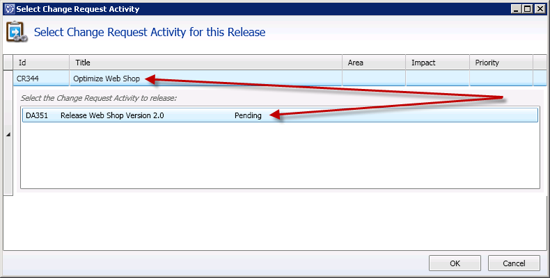 Now select the Change Request that you want to link the Release Activity to and the contained dependent activity in it.