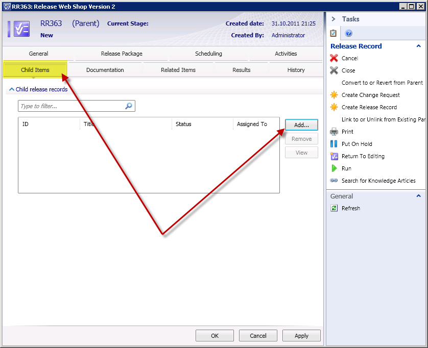 Now let’s create a new Release Record and link one of the activities to the existing Change Request. Just add a new Manual Activity to the Release Record, right-klick the activity and choose the appropriate option.