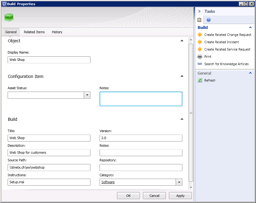 First let’s take a look at the new Configuration Items that you need for Release Management. You can now manage “Builds” which represents a Version/Build of a specific Software, Program, Operating System Image etc. Then you have “Environments” that allows you to manage your Prod, Pre-Prod-, Test-, Disaster- or whatever Environment. This is needed to make sure you know what build is used in which environment. In this example I created a single build for an Operating System Image.