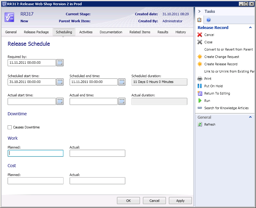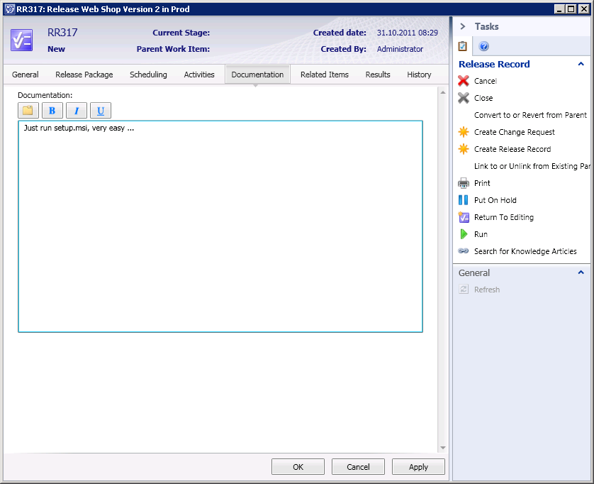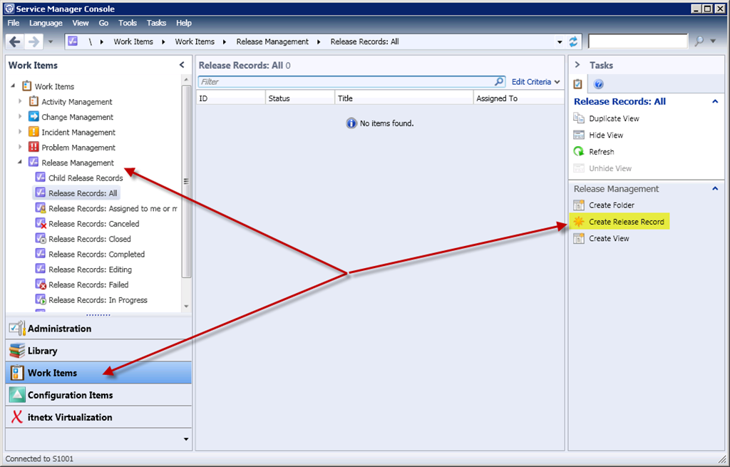 If we have this ready we can create a first Release Record. This should represent the release of this new Operating System Image in the production environment. Change to the Work Items Area, mark Release Management and click on the appropriate task.