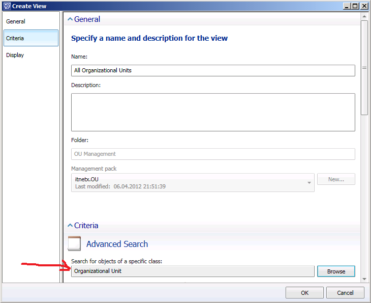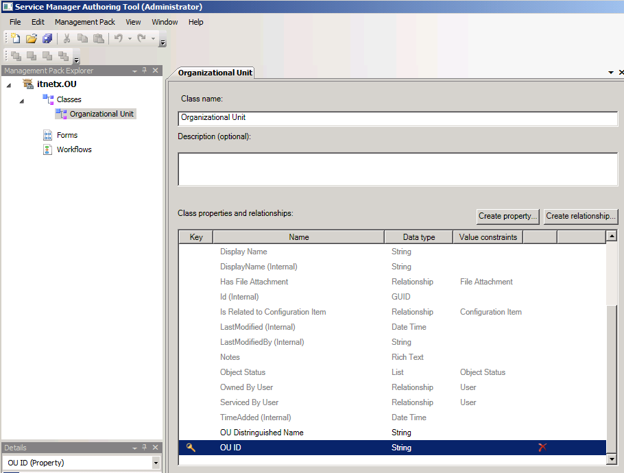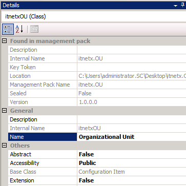Create a new MP, then create a new Class with the needed properties. For this example I create the Class “Organizational Unit” with two properties“OU ID” (Key, Autoincrement, Default Value) and “OU Distinguished Name”. If you need any details about using the Authoring Tool to create classes check out these posts: