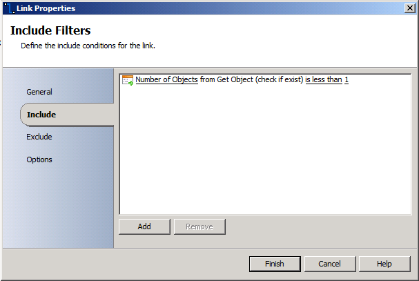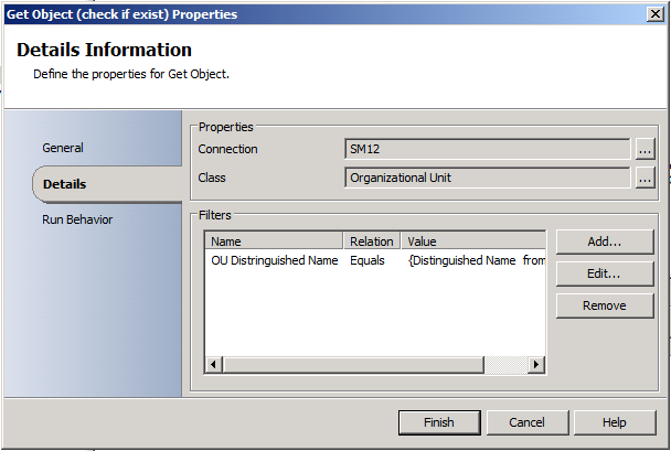 The third “Get Object” activity is from the Service Manager 2012 Integration Pack and is used to check if a CI for an OU already exists in the CMDB. For this I get all Objects of the “Organizational Unit” class and use a filter to check if a DN from a found OU matches a DN of an already existing OU CI.