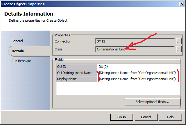 The last “Create Object” activity comes from the Service Manager 2012 Integration Pack and is used to create new Objects, in this examples new CIs of type “Organizational Unit”. To bring the information from the second activity in, I use published data to populate the property values.