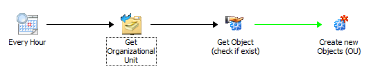 The Orchestrator Runbook must do two things: first read the available OUs from ADDS, and second write that information into the CMDB using the class we created before. very easy, huh? The simplest version of our runbook could look like this: