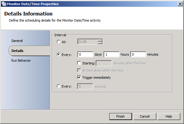 The first “Monitor Date/Time” activity is used to define the schedule, in my example the runbook is executed every hour and is started immediately after it has been checked in and started.