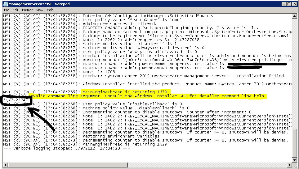 Today I ran into a problem when installing some new Private Cloud components for a customer. When installing SC Orchestrator 2012 and SC Service Manager 2012, after going through the wizard, I immediately got an MSI error with ID 1639 “Invalid Command Line Argument”. After taking a closer look at the installation log I found out why this was the case. This is the log of the Orchestrator Installation: