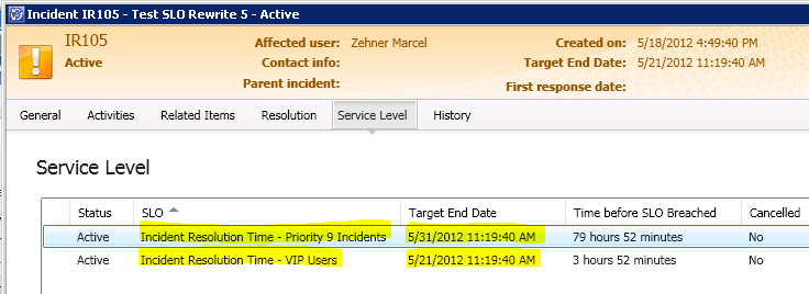 SM12 has a great feature for Service Level Management. I will not go into any details because this was already described here or here. With SM12 you are very flexible to deal with different service levels, metrics and also time zones. In the background things happen different from SM10 as now an object of type “Service Level Instance Time Information” is created for every new SLO that applies to an Incident. This object is then referenced to the incident. One Incident can have multiple SLOs applied, for instance one because an Incident is a Priority 5 Incident, and another one because the affected User is a VIP User. The downside of this approach is that handling the “target end date” of incidents is a bit more complex because you always have to use the relationships and then find out what the effective target end time is. This blog post shows how this can be made a little bit easier.