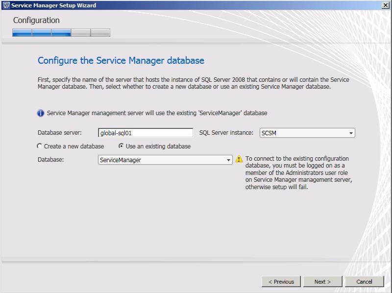 Now select the existing Service Manager database by entering the Server name and Instance of the SQL Server where the actual Service Manager Database is located.