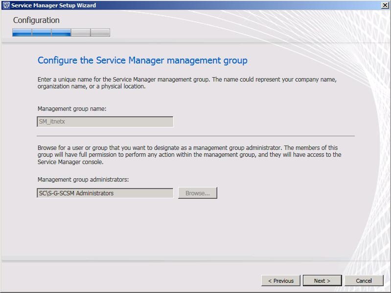 Setup now reads information from the database and detects the actual settings. Because the SM Management Groups already exists, the Management Group Name and the Management Group Administrators cannot be changed here.