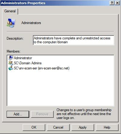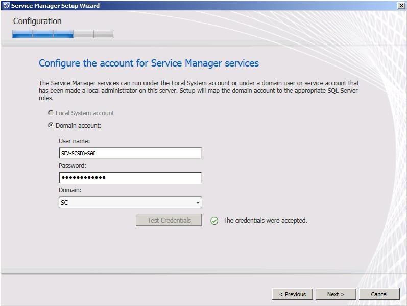 Now enter the credentials for the Service Manager Services. I would recommend using the same credentials here that you use on the existing Management Server. Before you continue, add this account to the local Administrators Group.