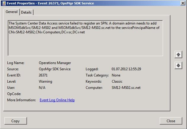 Then complete the wizard and wait for the installation process to complete. After Installation is done check the OperationsManager Event Log on the new Server. When your SM Service Account does not have administrative permissions in ADDS, you will get the following Warning.