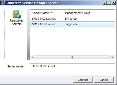 Now we are ready to use the new Management Server. Start the Service Manager console and try to connect to the new server. It should be displayed when you click on the “Registered Servers” button.