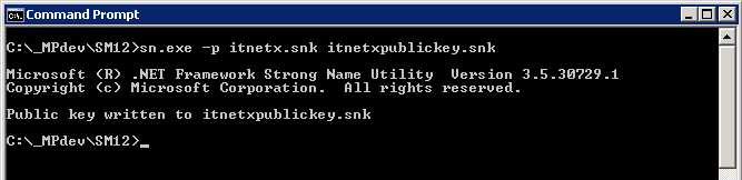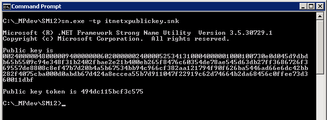 This generates another snk file that only holds the Public Key. This second file can now be used to calculate the Public Key Token, again by using sn.exe –> sn.exe –tp filenamepublickey.snk