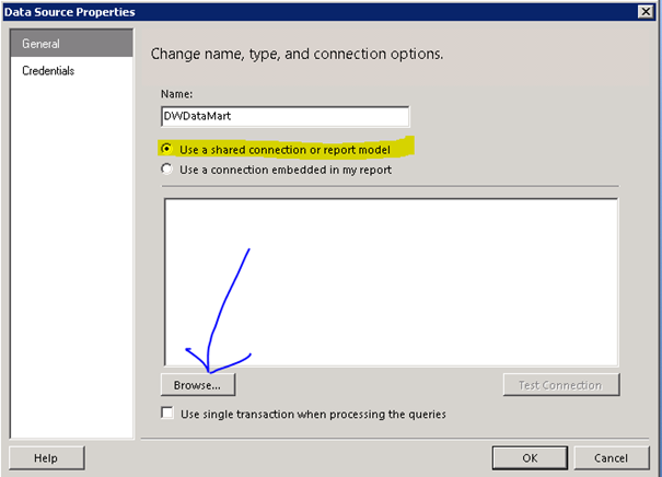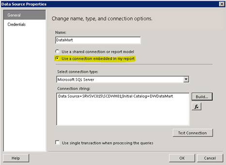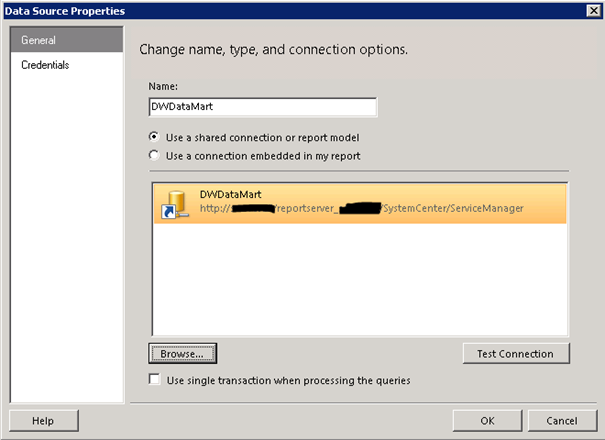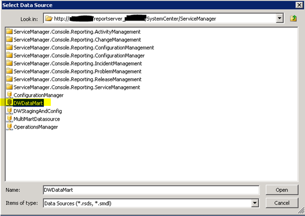 If you have multiple reports that use the same data source, this is the way to go. Because the data source is defined once and can be re-used in multiple reports, you can save time. The data source configuration is then stored on a Reporting Services server or a SharePoint server can be access by multiple reports. The reports that are delivered with Service Manager are using a shared data source. That means that a data source configuration for accessing the Data Mart is already available and we only have to connect to it.