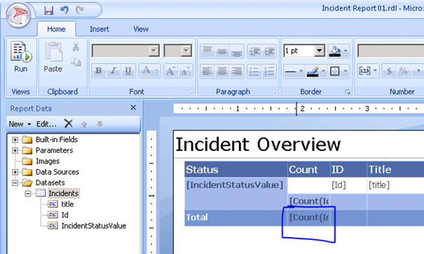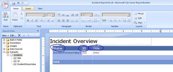 The SQL query gets the exact information out of the database and can later be used in the report. You can create your SQL queries directly in Management Studio and then transfer them to the data set configuration in the Report Builder. As you can see, in this very simple example I get all Incidents from the database and select id, title and status attributes.