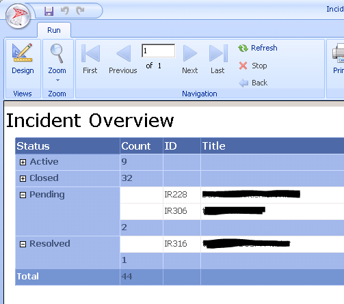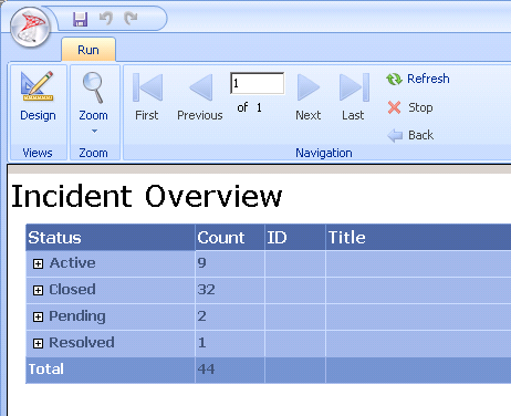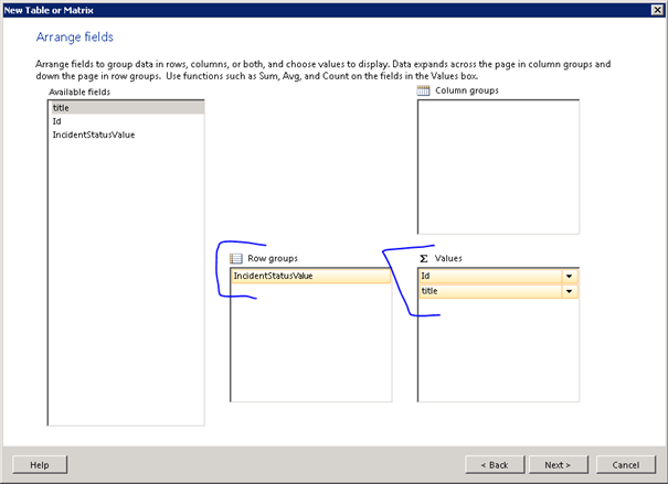 Now the fields from the data set can be dragged to the correct place. I want to have a grouped view of my Incidents based on the status, so I drag the status field to the row. Then I want to see the ID and Title in the details, so I drag those to the value area.